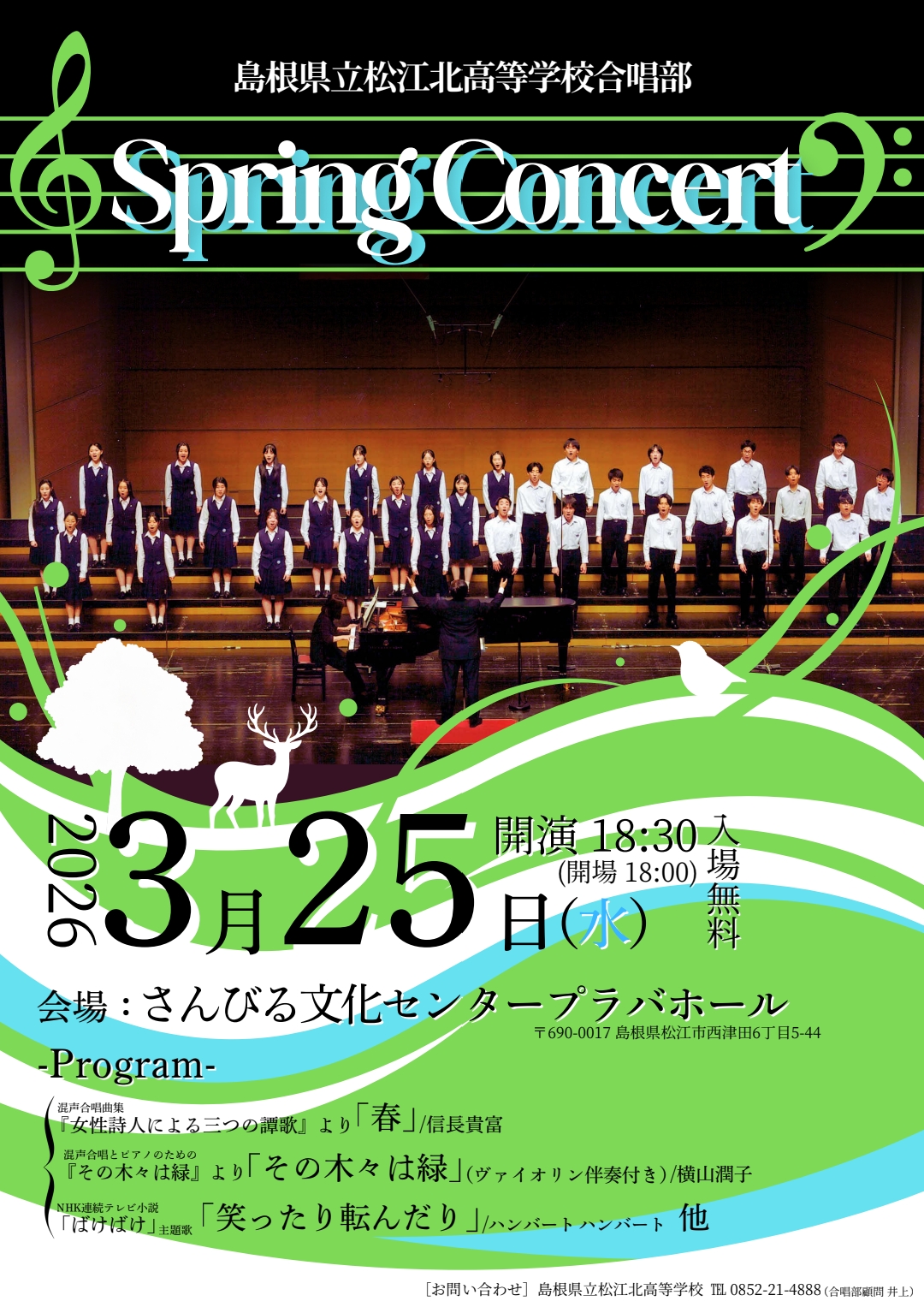 令和8年3月25日(水)に、「島根県立松江北高等学校合唱部 スプリングコンサート」が開催されますのでお知らせいたします。